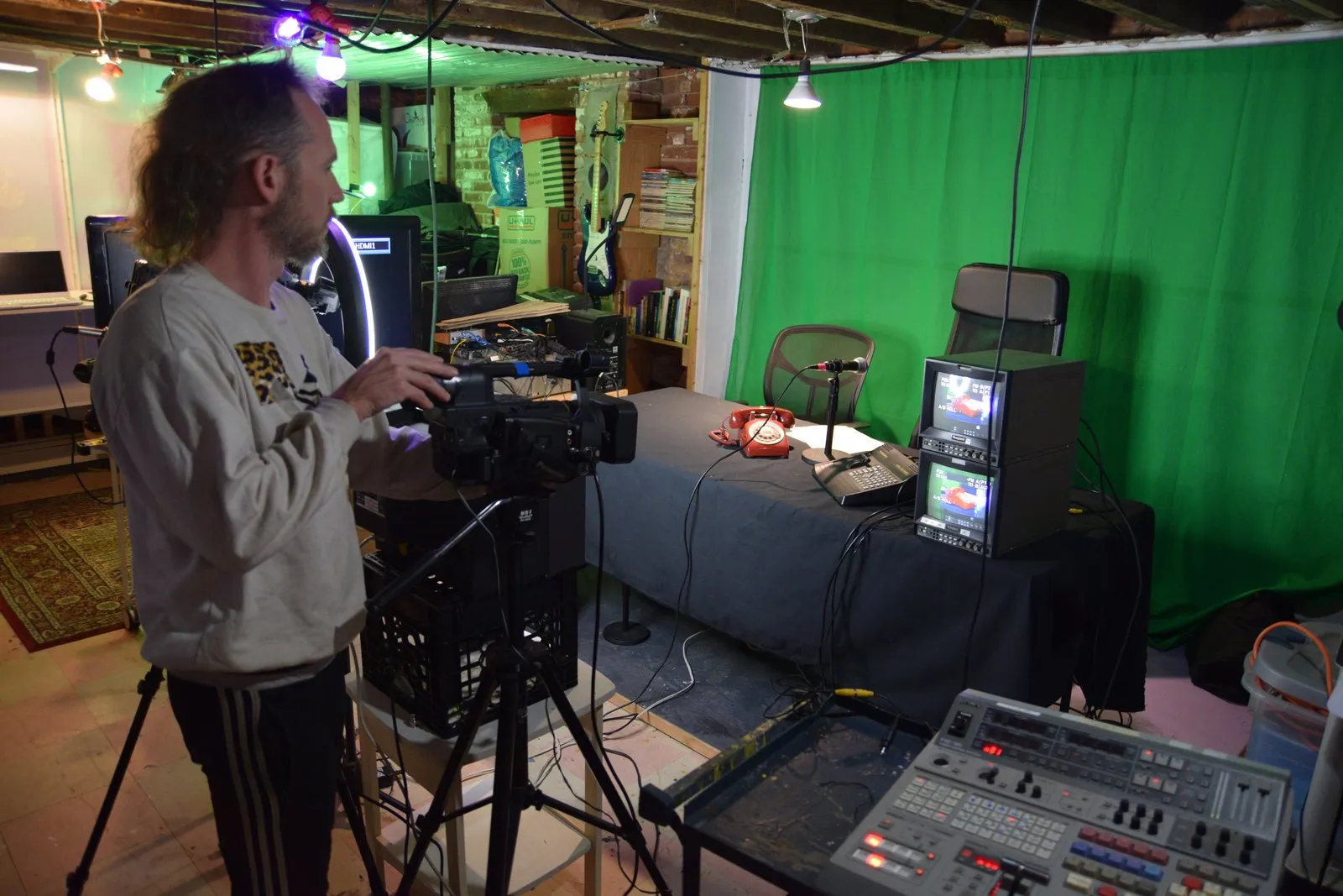 Andrei and I primarily controlled the video mixing and effects, while Rob and Allen played the news anchors, although I also appeared as a guest crystallography expert, and everyone did a little bit of everything. Find some behind-the-scenes photo documentation below.