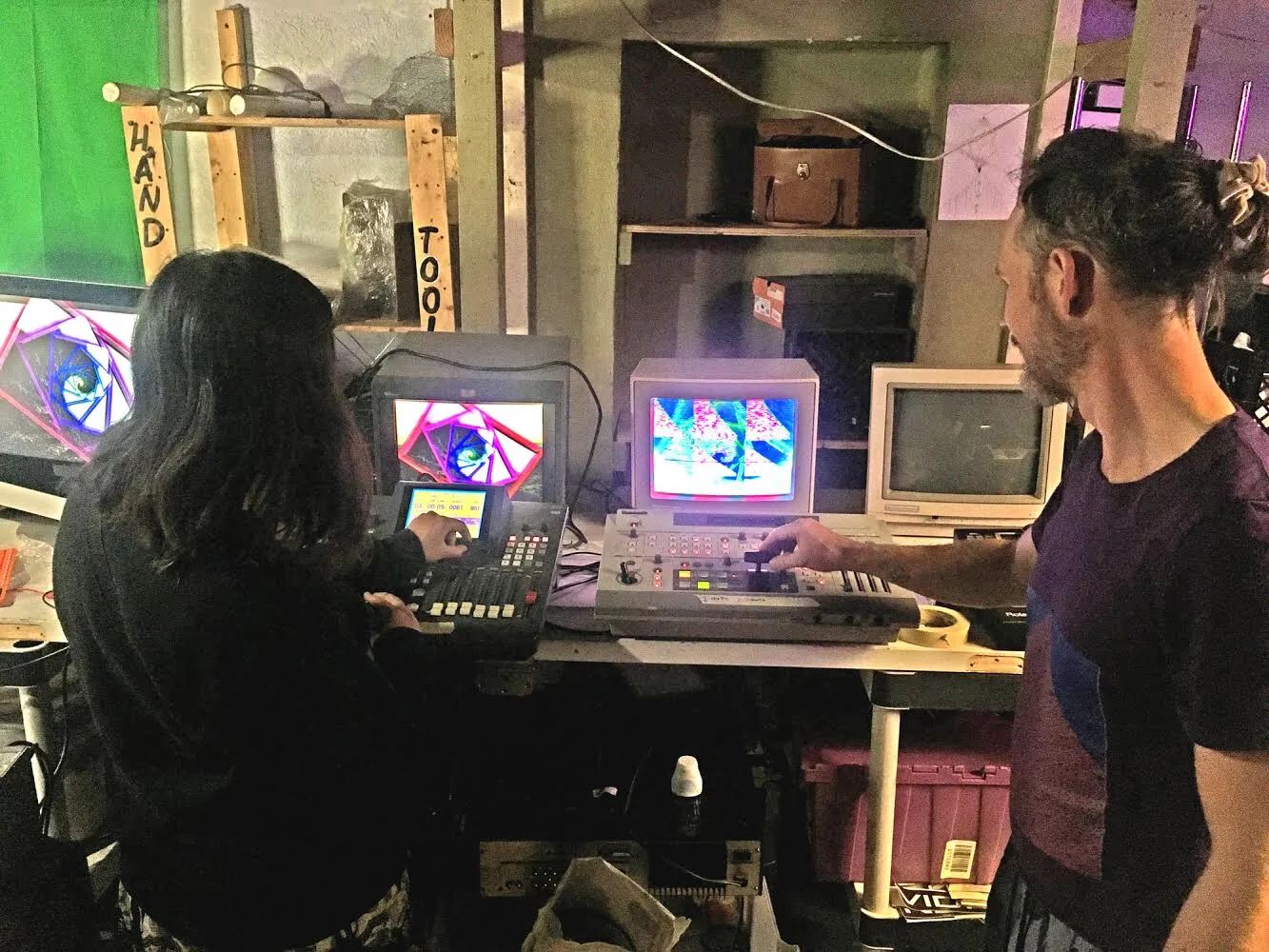 Recursive News was a livestream performance for /'FU:BAR/ Festival in 2020. I collaborated with Andrei Jay, Allen Riley, Rob Yohe, and Irfan Brković to create this piece in the basement studio of Phase Space in Brooklyn, NY during the Covid-19 shutdown. Our goal was to create an extremely psychedelic simulacrum of a cable access station news broadcast, using a series of analog video mixers plugged into each other and themselves in a labyrinthine nest of feedback loops and effects chains.