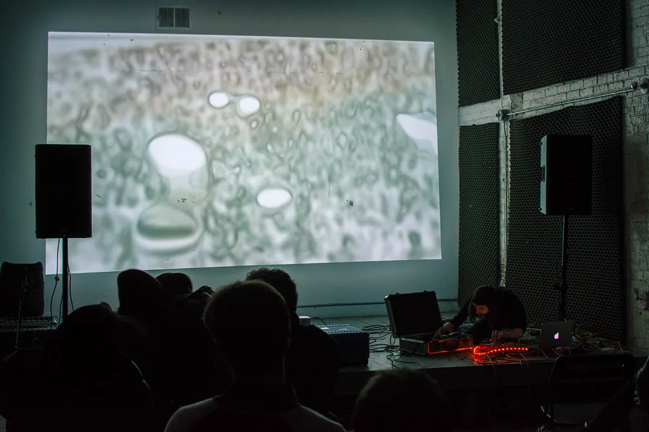 A photo from a memorable, nearly-cancelled a/v performance at H0L0 in Ridgewood, Queens during a blizzard on January 4. The only other performers who were able to make it to the venue in the icy conditions were Rue Bainbridge. A number of guests were also able to make their way through the snow to watch. The result was a very special and intimate atmosphere.