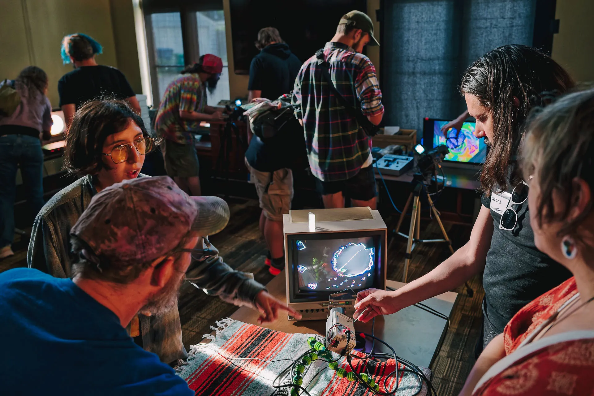 On July 20, we led a Phase Shift video art workshop at a public library in Minneapolis. With the help of our local artist friends, we were able to set up six stations for exploration of video feedback with cameras, processors, and mixers. Since Minneapolis has a thriving a/v art scene, there was a lot of interest, and many people came to participate. I also had an amazing time jamming with a bunch of people the following weekend.