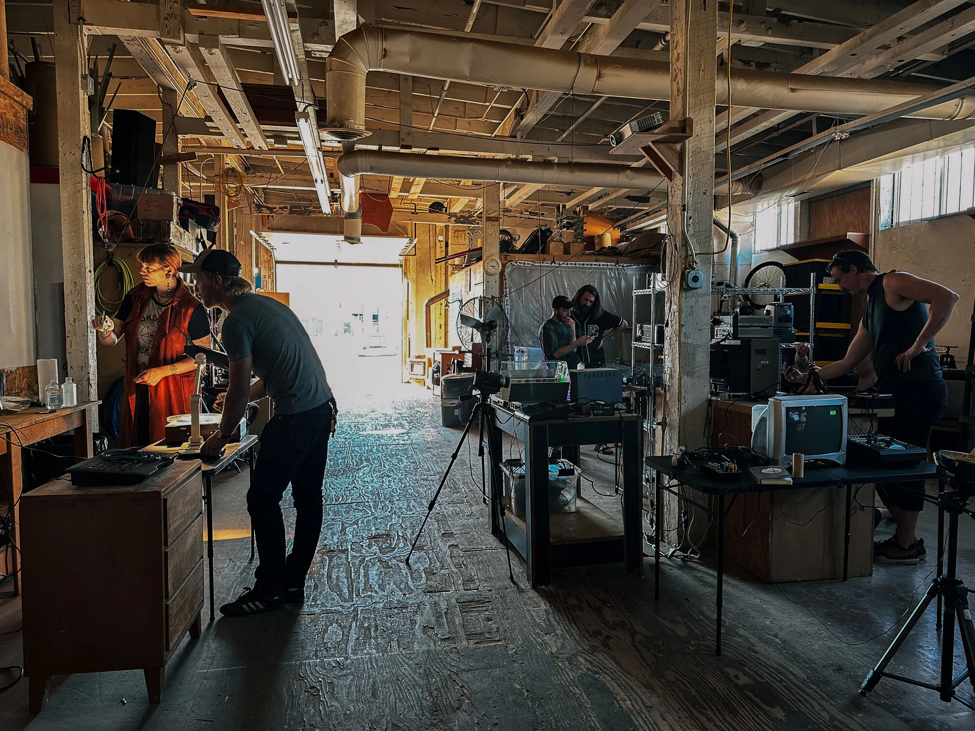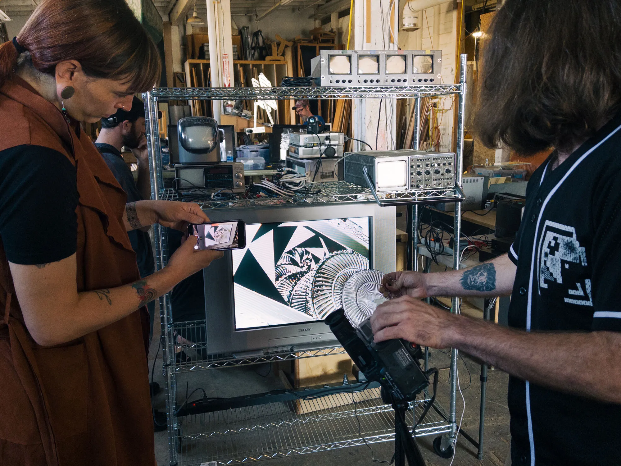 On October 7, we led a Phase Shift video art workshop at a private studio & wood shop in Eugene, Oregon. Attendees were a mixed group with some experienced video artists and some beginners, so it was cool to see the more experienced folks sharing their knowledge and personal techniques. Many thanks to Josiah Martens for hosting the event and to Adam Sladek for providing video equiment and some cool kaleidoscopic mirrors!