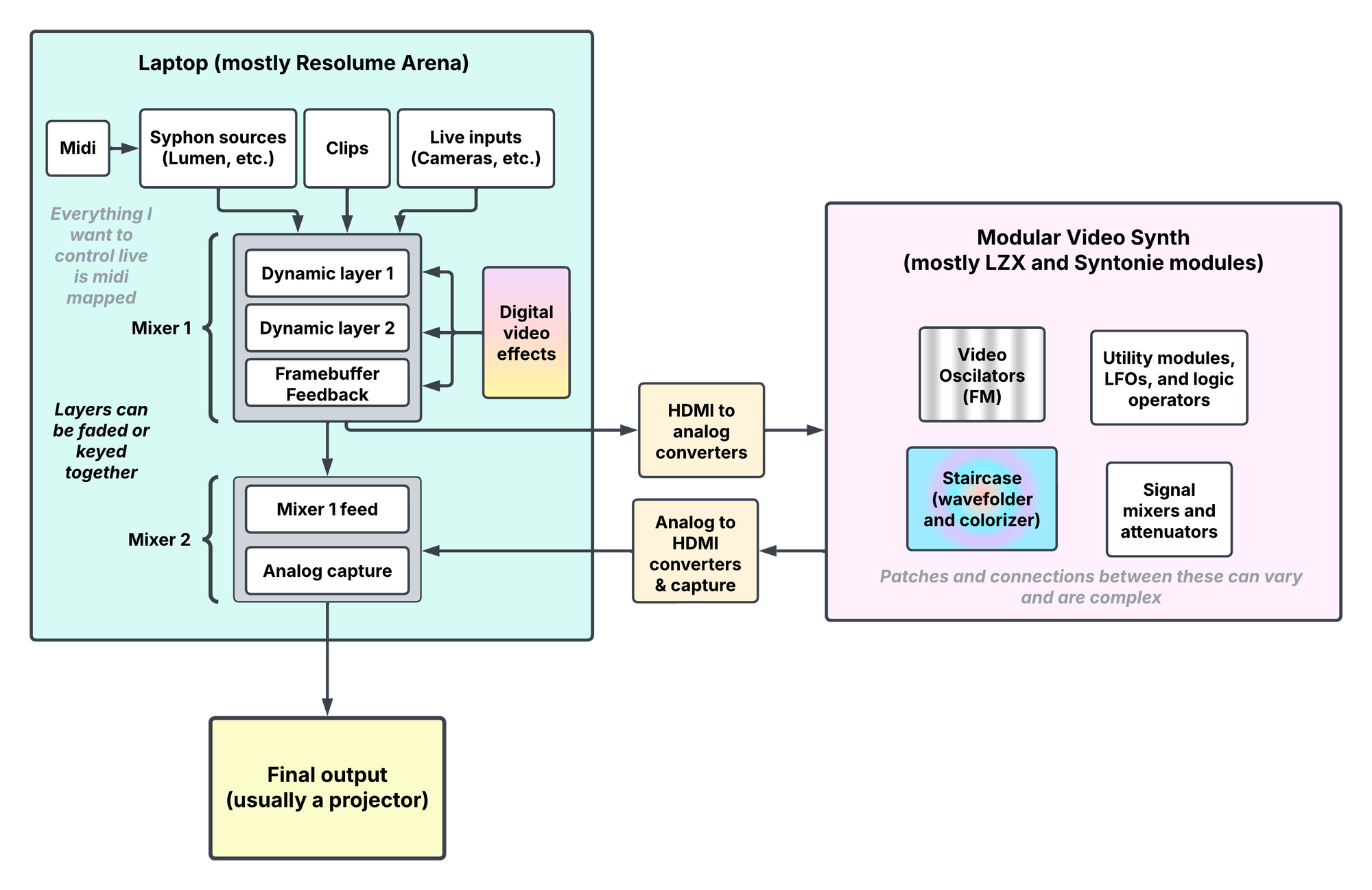 Since a few people were curious about my current live video performance setup, I made a flowchart of the process I used for both of these shows. I've been noodling around with it for a while (since I started using Resolume last year), and I keep finding new tricks and smoothing out quirks. I feel like I am able to make the most of both my analog and digital tools while also avoiding the pitfalls of either. Also, it's compact enough for me to carry everything at once — at least for short distances.