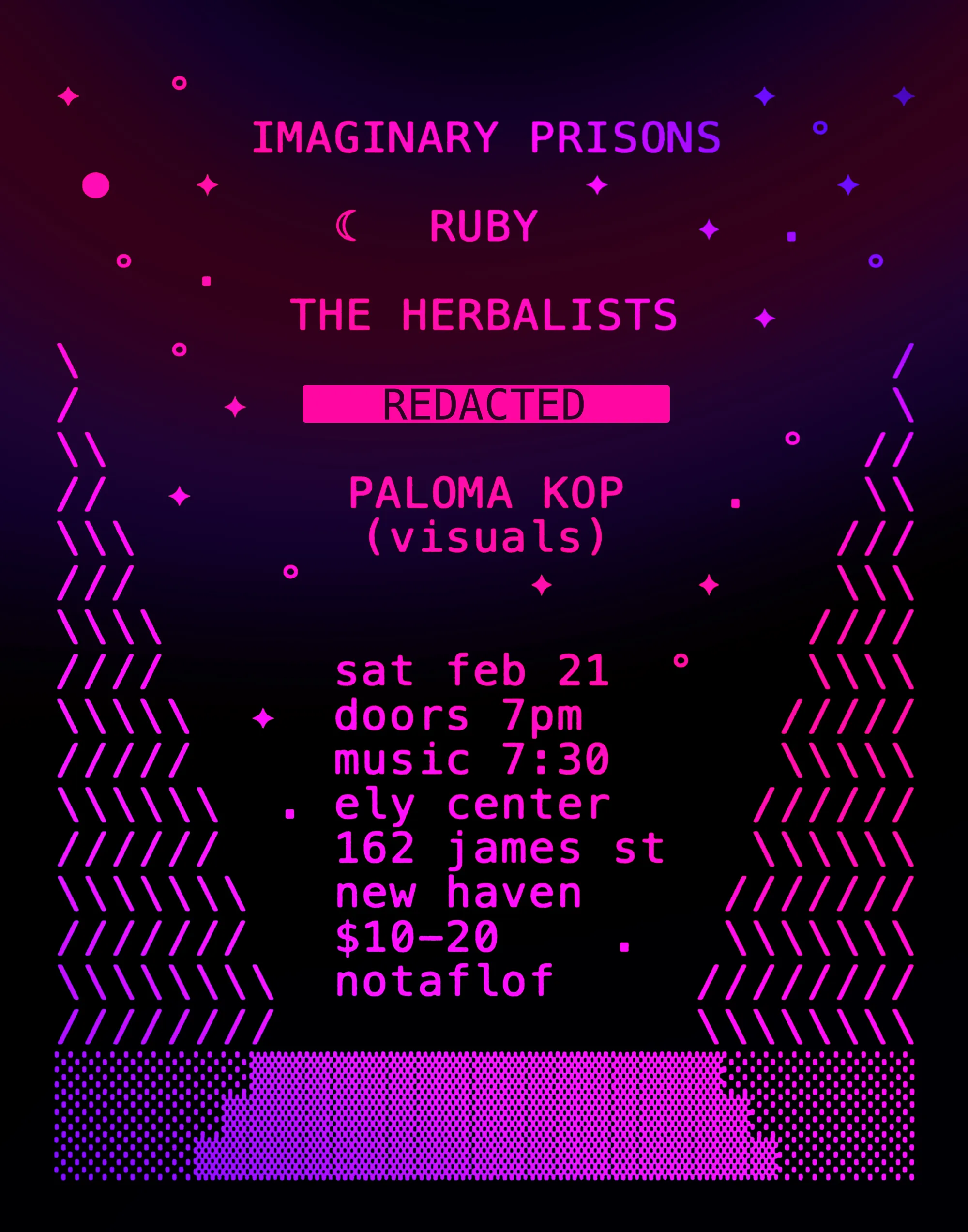 I helped organize this show featuring touring friends from Worcester, MA, Imaginary Prisons (experimental synths + soundscapes) and RUBY (livecoded electronica). Local support from The Herbalists (dungeon synth) and another artist yet to be announced.