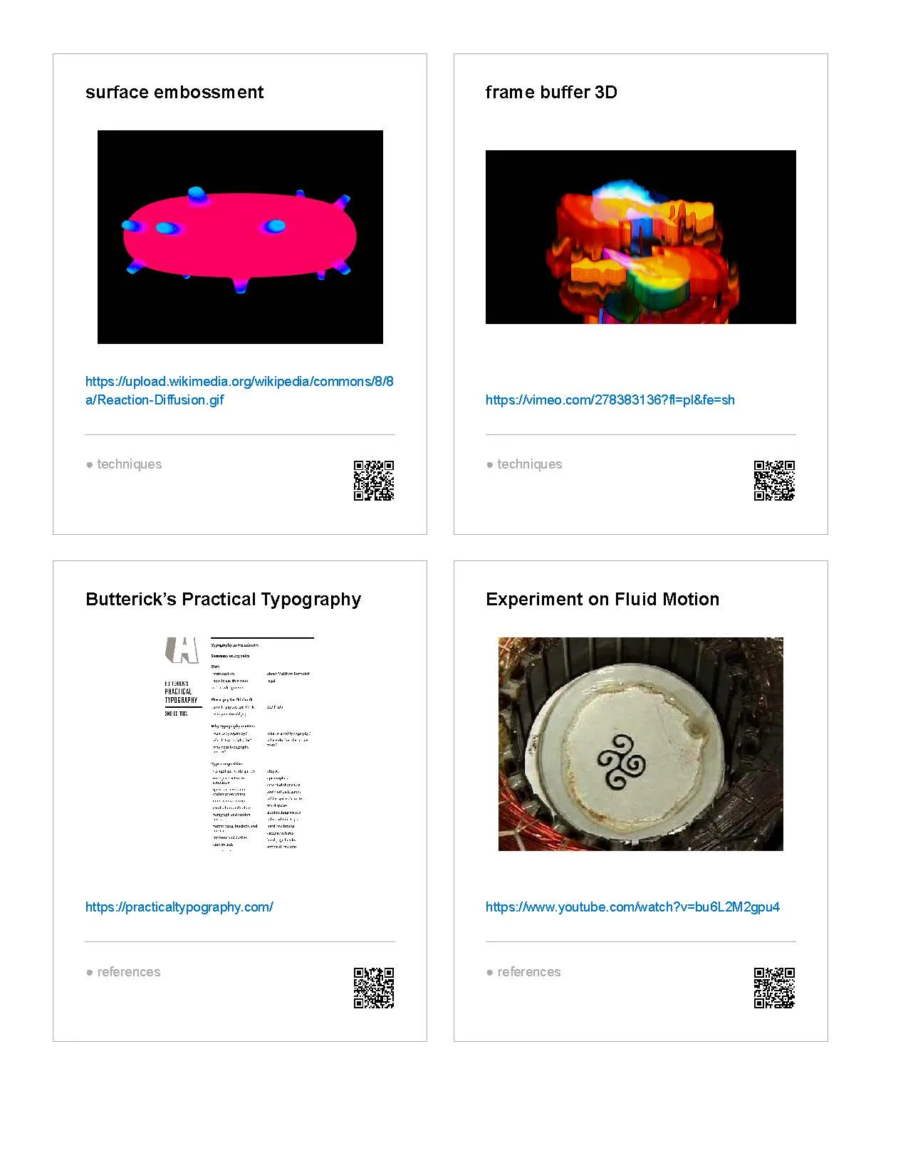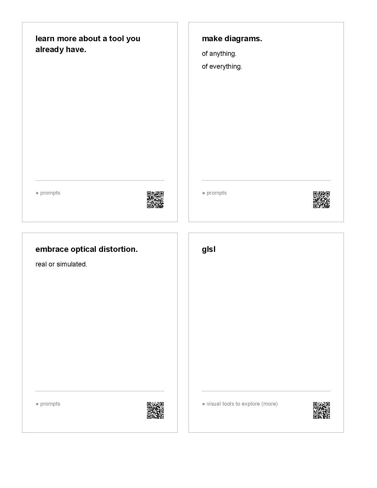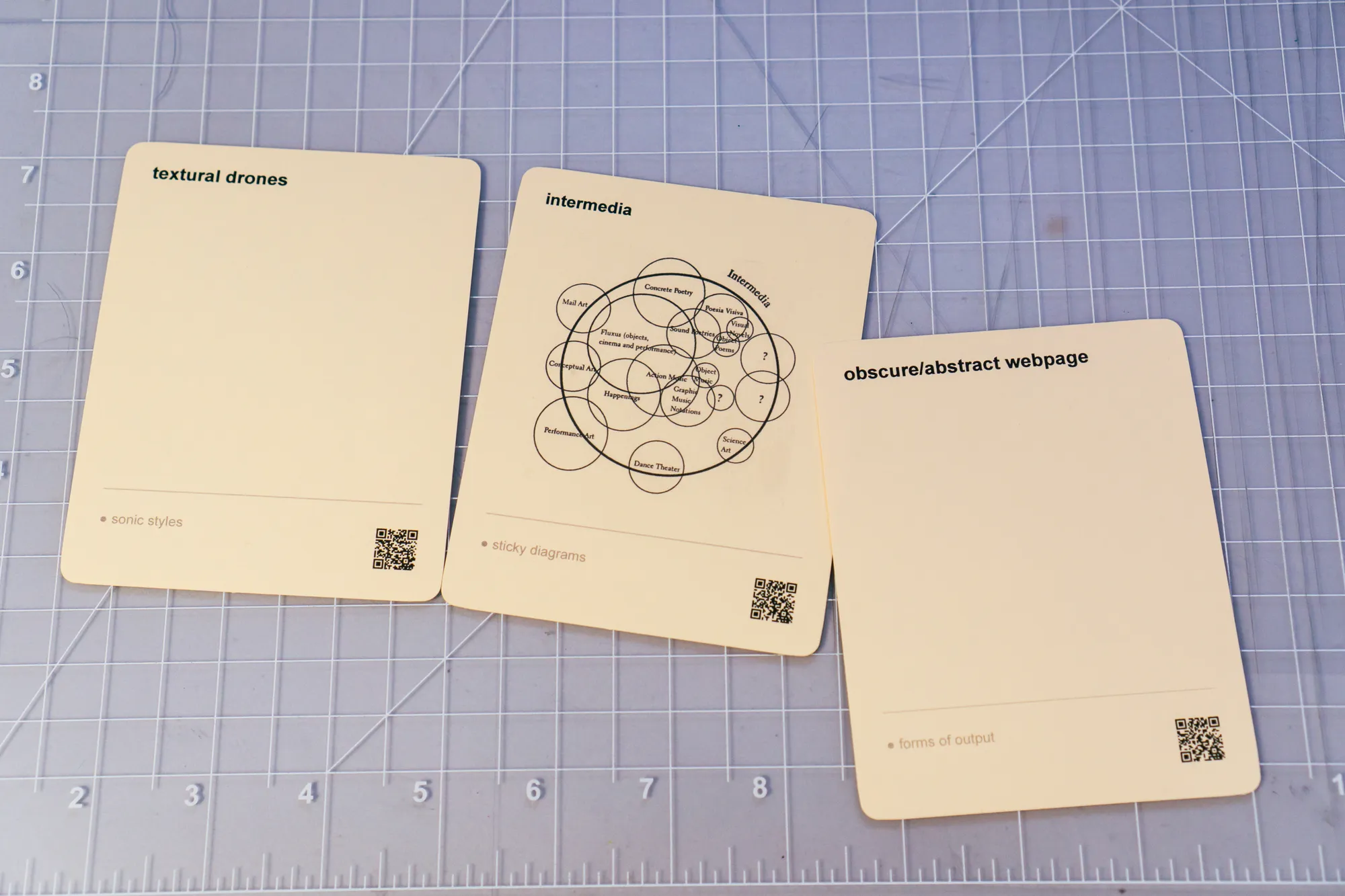 Some of my blocks in Are.na contained links to documents, webpages, or videos that the card itself could not fully convey. So in order to create a link between the physical cards and their counterparts in Are.na, I added small QR codes at the bottom of each card.